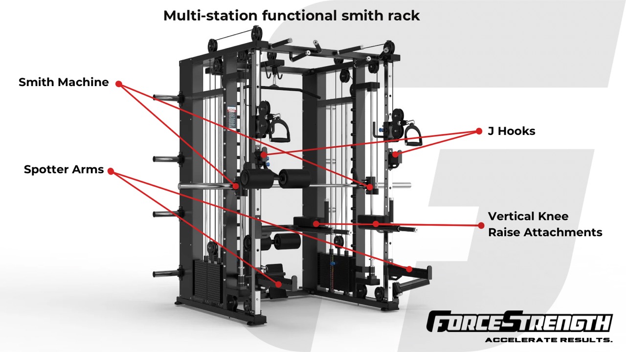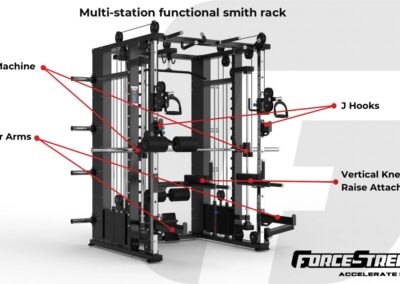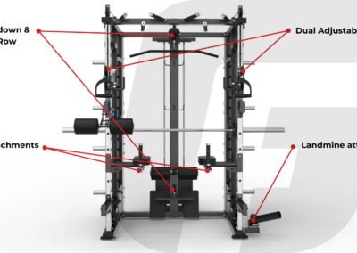 Smith Machine; Functional Trainer; Lat pulldown/seated row & Half Rack – Attachments; 2 Handles, Lat Pulldown Bar, Straight Bar, Curl Bar, Land Mine, Double End Rope, Dip Bars, vertical knee raise ,1 Pair Weight Collars,