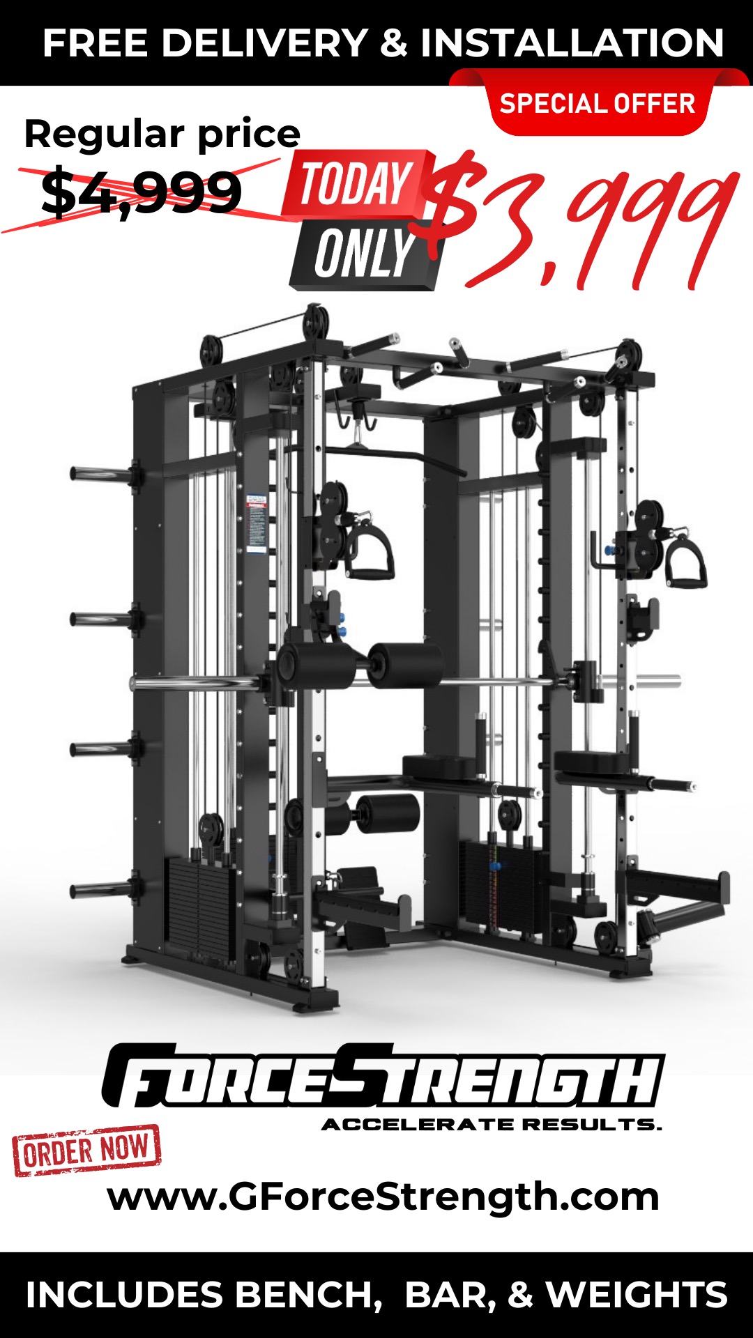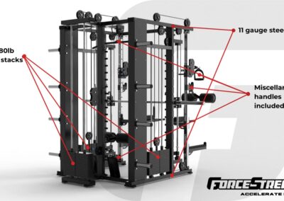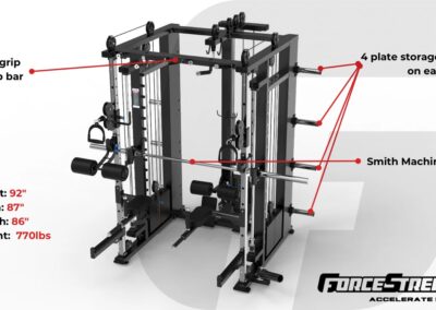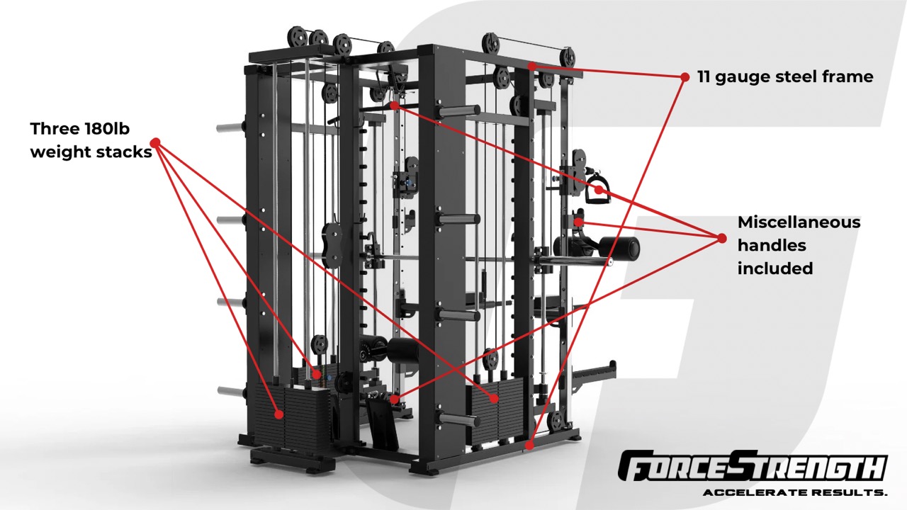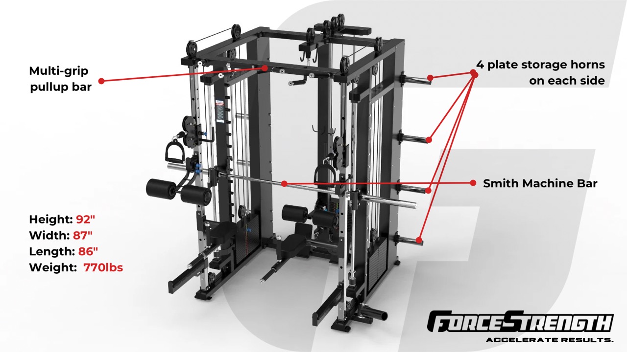 The GForce Commercial Functional Smith Rack is the universal station that covers over 25 exercises in a 8ft x 7ft x 8ft configuration. This machine is perfect for home use but durable enough for commercial gym use. This machine brings the gym straight to your home with the same caliber of durability seen in commercial gyms. Equipped with 3 independent weight stacks including one dedicated for lat pulldown and seated row, and two adjustable pulley, 150 lbs x 3 of cast iron Olympic weight stacks, and a smith machine. The days of driving all the way to the gym to wait for a machine are over.