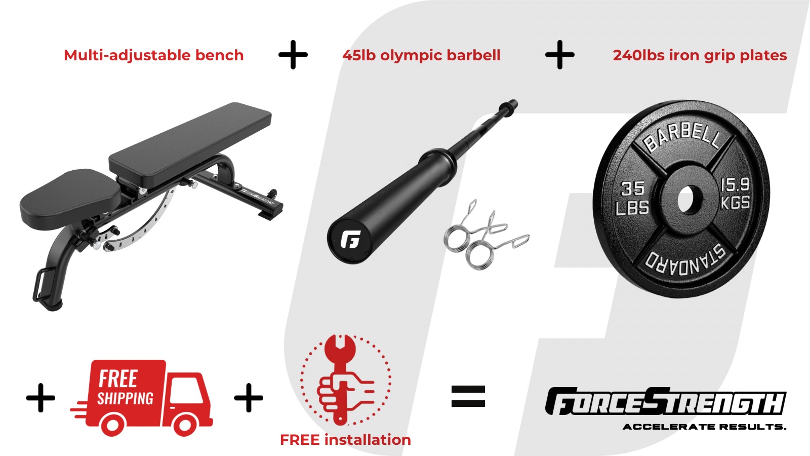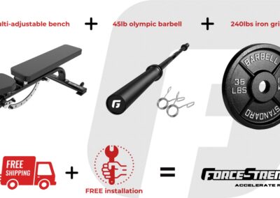 Includes Full Olympic Weight Set, Olympic Barbell and Adjustable Bench